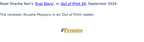 Evol story (Out of Print 54, September 2024) is a clever narrative that takes readers on a journey through the reverse evolution of Prakash, who openly wears his heart on his sleeve. By the end of the first section, it’s clear there’s a girl and a boy – when their chemistry ignites, readers smell fire. The story unfolds in a reverse narrative style, alerting readers to play detective.
